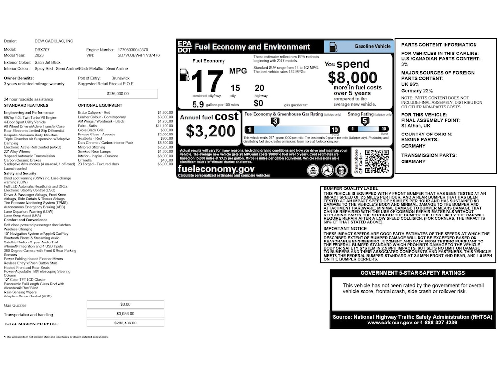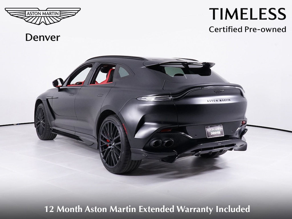 Certified. Q Satin Jet Black 2023 Aston Martin DBX 707 AWD 9-Speed Automatic 4.0L V8 14 Speakers, Adaptive suspension, Auto-leveling suspension, Brake assist, Electronic Stability Control, Mirrored Stitching, Navigation System, Power Liftgate, Q-2x2 Twill Carbon Fiber Trim w/Dark Satin Chrome, Red Painted Brake Calipers, Red Seatbelts, Remote keyless entry, Smoked Tail Lights, Umbrella & Holder, Wheels: 23" Forged Textured Black.