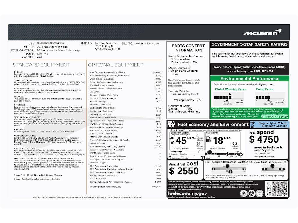 Indy Orange 60th Anniversary Triple Crown 2024 McLaren 750S RWD 7-Speed Automatic V8 Carbon Fibre Gloss Sill Trim, 60th Anniversary Triple Stripe, 60th Anniversary Kiwi Logo, 60th Anniversary Calipers - Indy Blue, 360 Degree Park Assist, Carbon Black Alcantara Steering Wheel, Carbon Fiber Body Color Fr Fenders & Louvres Upgrade, Exterior Details Carbon Fiber Pack, Gloss Carbon Fiber Upper Trim, HomeLink, Radio: Bowers & Wilkins 12-Speaker Audio System, Sound Comfort Windscreen, Stealth Exhaust Finisher, Titanium Locking Wheel Bolts, Wheels: Gloss Black Strike Forged Alloy 10-Spoke.