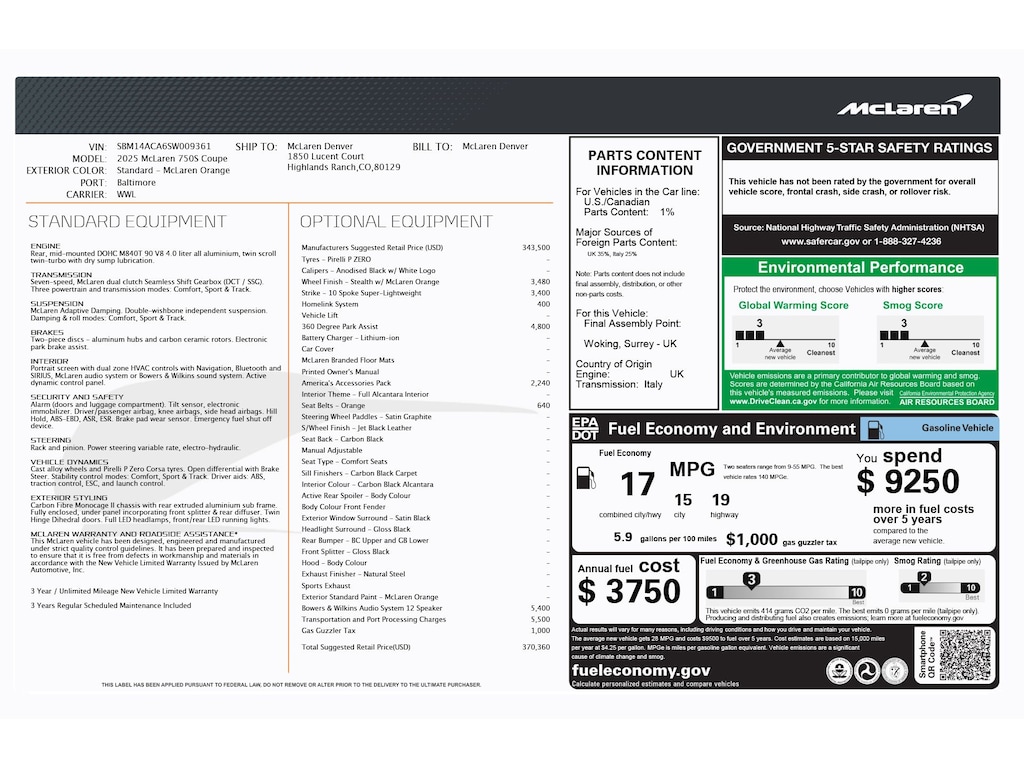 Certified. McLaren Orange 2025 McLaren 750S Coupe RWD 7-Speed Manual 4.0L V8 ABS brakes, Alloy wheels, Brake assist, Compass, Electronic Stability Control, Exterior Parking Camera Rear, Front dual zone A/C, Heated door mirrors, Illuminated entry, Low tire pressure warning, Navigation System, Remote keyless entry, Traction control.