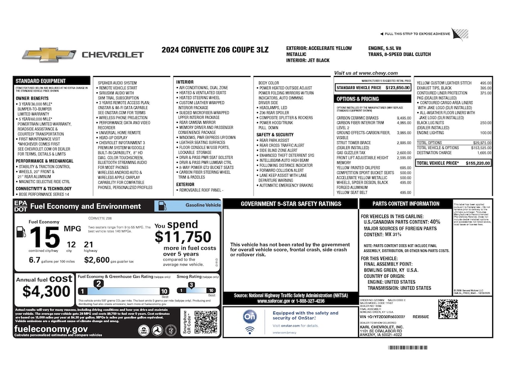 Accelerate Yellow Metallic 2024 Chevrolet Corvette Z06 3LZ RWD 8-Speed Dual Clutch 5.5L V8 2 Cargo Nets, All-Weather Floor Liners w/Jake Logo (LPO), Automatic Leveling System Headlamp Control, Bose Performance Series Sound System w/14 Speakers, Carbon Fiber Interior Trim, Carbon-Flash Painted Carbon Fiber Ground Effects, Contoured Cargo Area Liners w/Jake Logo (LPO), Contoured Liner Protection Package (LPO), Custom Leather Wrapped Interior Package, Driver Power Bolster Seat Adjuster, Edge Yellow-Painted Calipers, Electrical Theft Deterrent System, Front Lift Adjustable Height w/Memory, HD Front & Rear Vision Cameras, Heated & Vented Driver & Passenger Seats, Heated front seats, Heated Steering Wheel, Memory Driver & Passenger Convenience Package, Napa Lthr Seating Surfaces w/Perforated Inserts, Navigation System, Passenger Power Bolster Seat Adjuster, Performance Data & Video Recorder, Power Driver Lumbar Control Seat Adjuster, Power Passenger Lumbar Control Seat Adjuster, Power-Adjustable Outside Heated Mirrors, Preferred Equipment Group 3LZ, Rear Cross Traffic Alert, Side Blind Zone Alert, Sueded Microfiber-Wrapped Upper Interior Trim Pkg, Universal Home Remote, Vehicle Inclination Theft Deterrent Sensor, Vehicle Interior Movement Theft Deterrent Sensor, Wireless Charging for Devices.