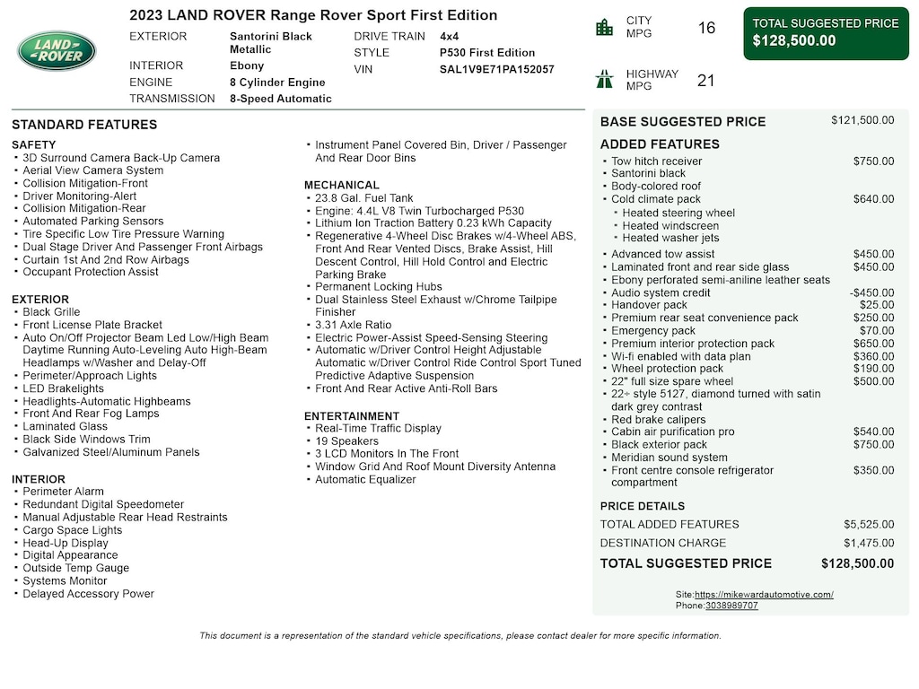 Santorini Black Metallic 2023 Land Rover Range Rover Sport First Edition 4WD 8-Speed Automatic 4.4L V8 Twin Turbocharged 19 Speakers, Adaptive suspension, Advanced Tow Assist, Air Conditioning, Apple CarPlay & Android Auto, Auto-leveling suspension, Brake assist, Cold Climate Pack, Electronic Stability Control, Exterior Parking Camera Rear, Heated front seats, Heated rear seats, Heated Steering Wheel, Heated steering wheel, Heated Washer Jets, Heated Windscreen, Navigation system: InControl Navigation Pro, Perforated Semi-Aniline Leather Seat Trim, Power Liftgate, Power moonroof, Remote keyless entry, Tow Hitch Receiver, Ventilated front seats, Wheels: 22" Diamond Turned (Style 5127).