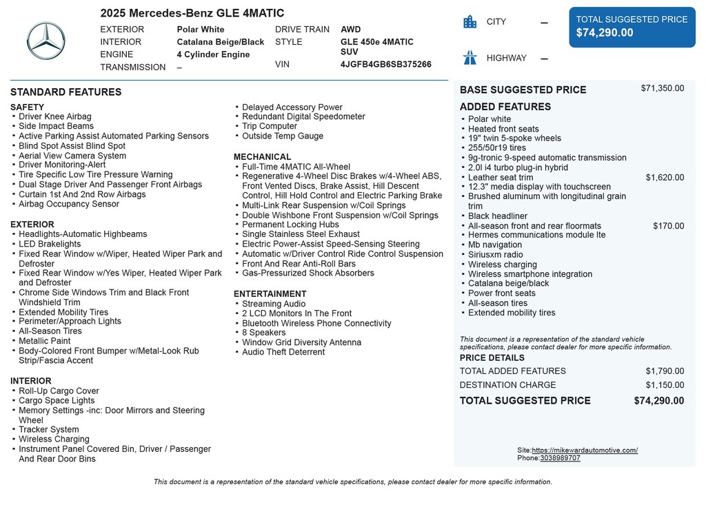 Polar White 2025 Mercedes-Benz GLE GLE 450e 4MATIC® 4MATIC® 9-Speed Automatic 2.0L I4 Turbocharged 2.0L I4 Turbocharged, 8 Speakers, Apple CarPlay®/Android Auto®, Automatic temperature control, Brake assist, Electronic Stability Control, Extended Mobility Tires, Exterior Parking Camera Rear, Four wheel independent suspension, Heated door mirrors, Heated front seats, Illuminated entry, Leather steering wheel, Navigation system: MBUX, Power Front Seats, Power Liftgate, Power moonroof, Power passenger seat, Remote keyless entry, Wheels: 19" Twin 5-Spoke.