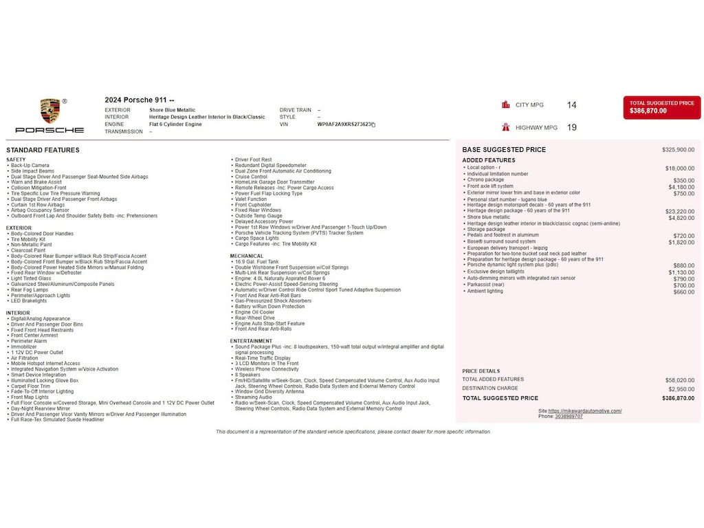 Shore Blue Metallic 2024 Porsche 911 S/T RWD 6-Speed Manual 4.0L H6 DOHC 24V LEV3-LEV160 518hp Adaptive suspension, Brake assist, Electronic Stability Control, Exterior Parking Camera Rear, Four wheel independent suspension, Front Center Armrest, Illuminated entry, Leather Seat Trim w/Fabric Center, Navigation system: Porsche Communication Management (PCM), Remote keyless entry, Sound Package Plus.