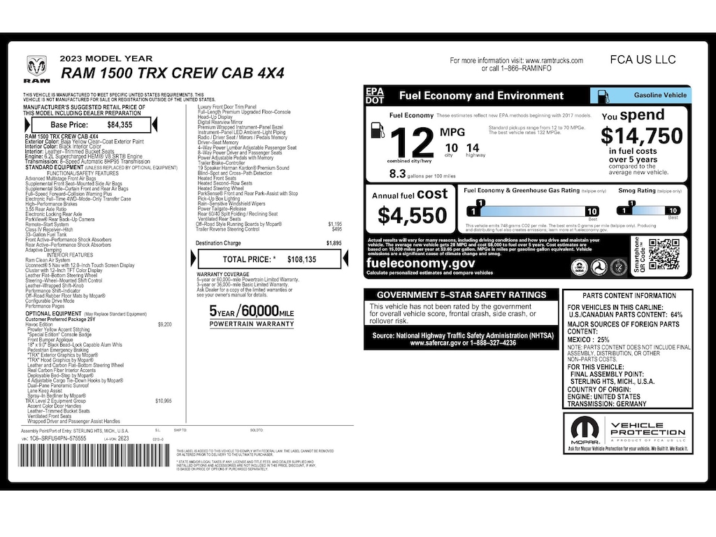 Baja Yellow Clearcoat 2023 Ram 1500 TRX 4WD 8-Speed Automatic 6.2L Supercharged HEMI V8 SRT #2 Seat Foam Cushion, 2-Door Passive Entry, Front Door Locks, 4 Way Front Headrests, Accent Color Door Handles, Blind Spot & Cross Path Detection, Bucket Seats, Center Console Parts Module, Digital Rearview Mirror, Driver Seat Memory, Driver/Passenger Wrapped Assist Handles, Exterior Mirrors w/Memory, Front Door Accent Lighting, Front Seat Back Map Pockets, Full Length Premium Upgraded Floor Console, harman/kardon 19 Speaker Premium Sound, Heads-Up Display, Heated Front Seats, Heated Second Row Seats, Heated Steering Wheel, IP LED Ambient Light Pipe, Leather Trimmed Bucket Seats, Leather/Suede Flat-Bottom Steering Wheel, LED CHMSL Lamp, Luxury Front Door Trim Panel, MOPAR Bright Pedal Kit, Navigation System, ParkSense Front/Rear Park Assist w/Stop, Pick-Up Box Lighting, Power 4-Way Driver Lumbar Adjust, Power 4-Way Passenger Lumbar Adjust, Power 8-Way Driver & Passenger Seats, Power Adjustable Pedals w/Memory, Premium Wrapped IP Bezel, Quick Order Package 29Y, Radio/Driver Seat/Mirrors/Pedals Memory, Rain Sensitive Windshield Wipers, Rear 60/40 Folding Seat, Rear 60/40 Folding Split Recline Seat, Rear Door Accent Lighting, Rear Underseat Compartment Storage, Rear Window Defroster, Remote Tailgate Release, Sun Visors w/Illuminated Vanity Mirrors, Surround View Camera System, Trailer Brake Control, TRX Level 2 Equipment Group, Universal Garage Door Opener, Ventilated Front Seats, Ventilated Rear Seats, Wireless Charging Pad.